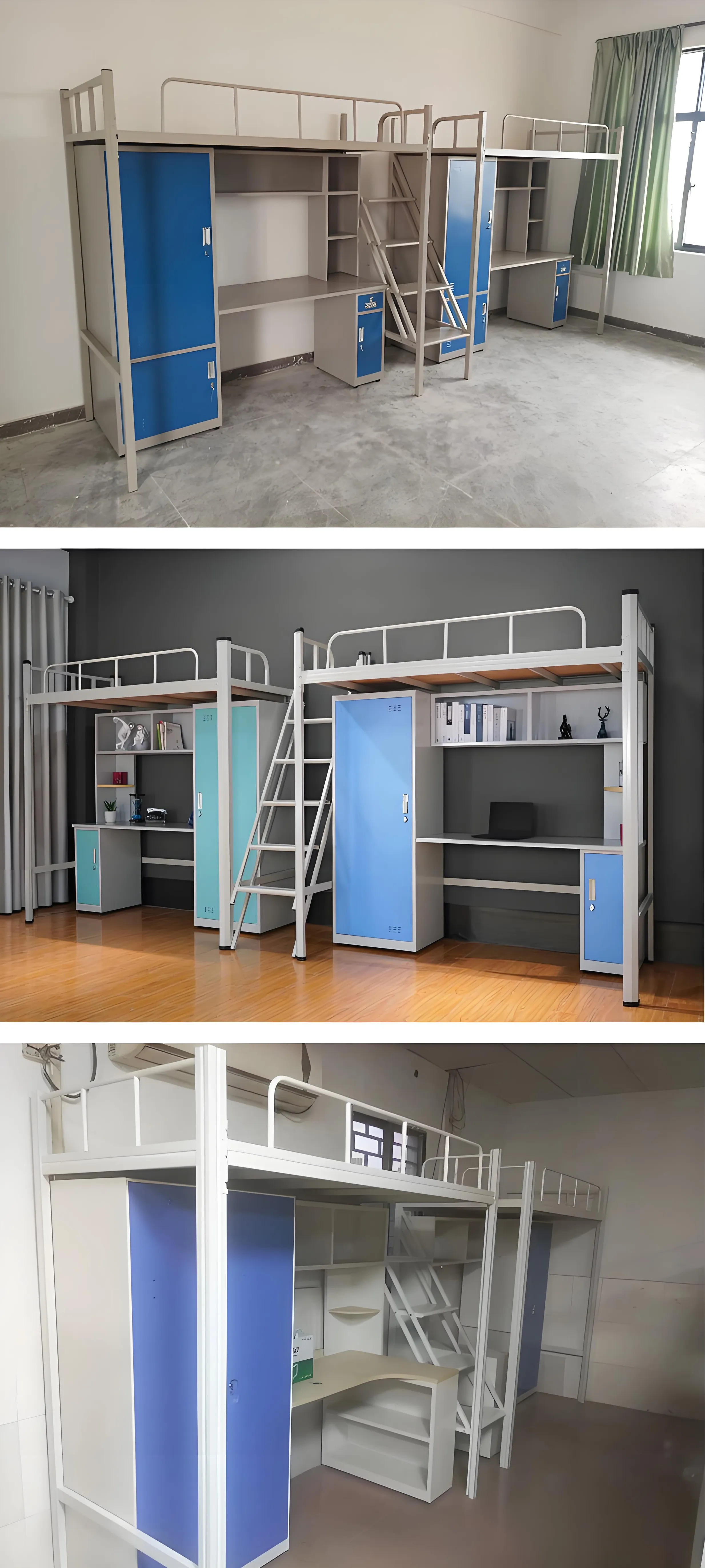 A bunk bed in an apartment consists of a bed, a bookcase, a wardrobe, a desk, and a ladder frame. The bookcase and wardrobe are connected to the inner side of the bed frame's legs. The desk connects the bookcase and the wardrobe together. A ladder frame is installed at one end of the bed frame where the bookcase is located, and there is a guardrail at the other end of the bed frame on the same side as the ladder frame. Under the desktop of the desk, there is a keyboard stand and a drawer frame. Since the bed is a three-dimensional space combination, it not only saves space but also is neat and beautiful, and easy to manage.